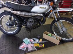 長崎県島原市からご来店頂きエルシノア125をお買上げ頂き有り難う御座います。早速整備に取り掛かっております、キャプの燃調キットの交換はして有りますのでエンジン好調ですが点火系のポイントのすり合わせをして調整を行いました。部品もバッテリ-、プラグ、クリーナ-、チェーンの交換を行います。入庫時に通勤試乗を行い問題有りませんでしたが再度長めの試乗を行います、明日のツーリングに乗って行く予定にしてますが雪が降りそうなので心配です。😅⛄