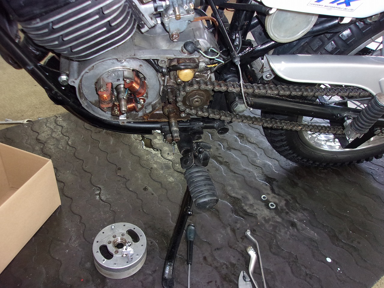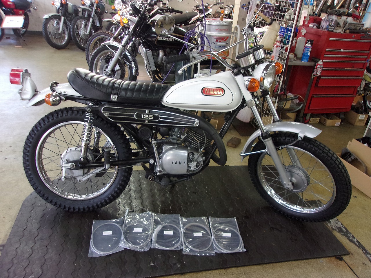 キャブの燃調キットは入庫時に交換していましたのでポイントのすり合わせをして調整を行いプラグの交換をしましたのでキック一発始動でエンジン好調です。ヤフオクで落としたワイヤ-5本セットも昨日入庫しましたので早速交換します。整備中のDT1とバイソンの整備と同時進行で行いますが少しお時間を頂く事となりますがご理解の程、宜しくお願いいたしま。🙇♂️