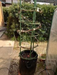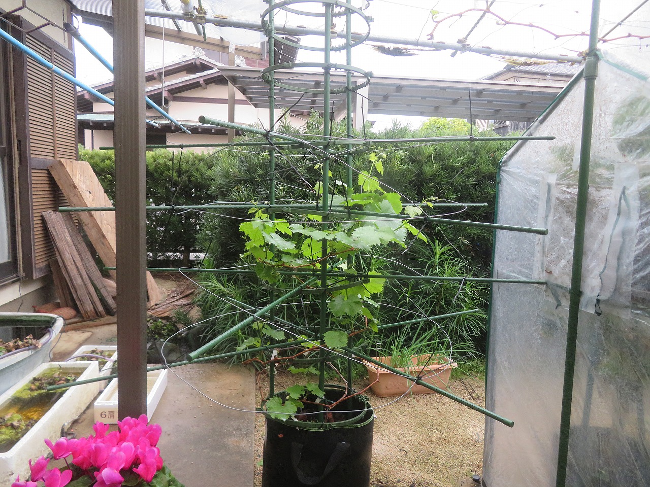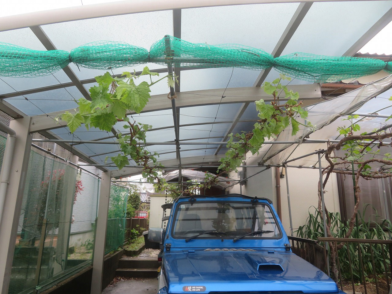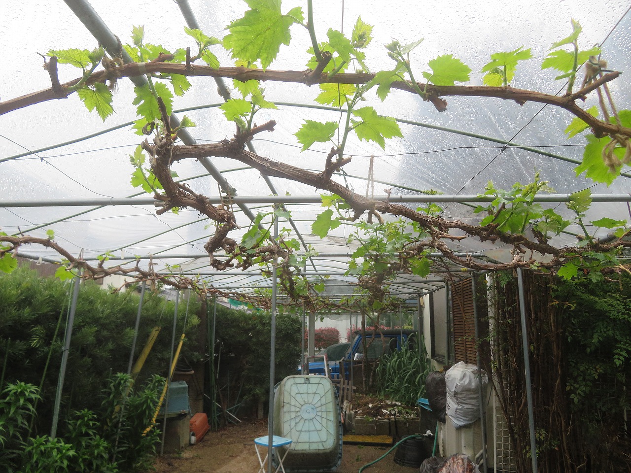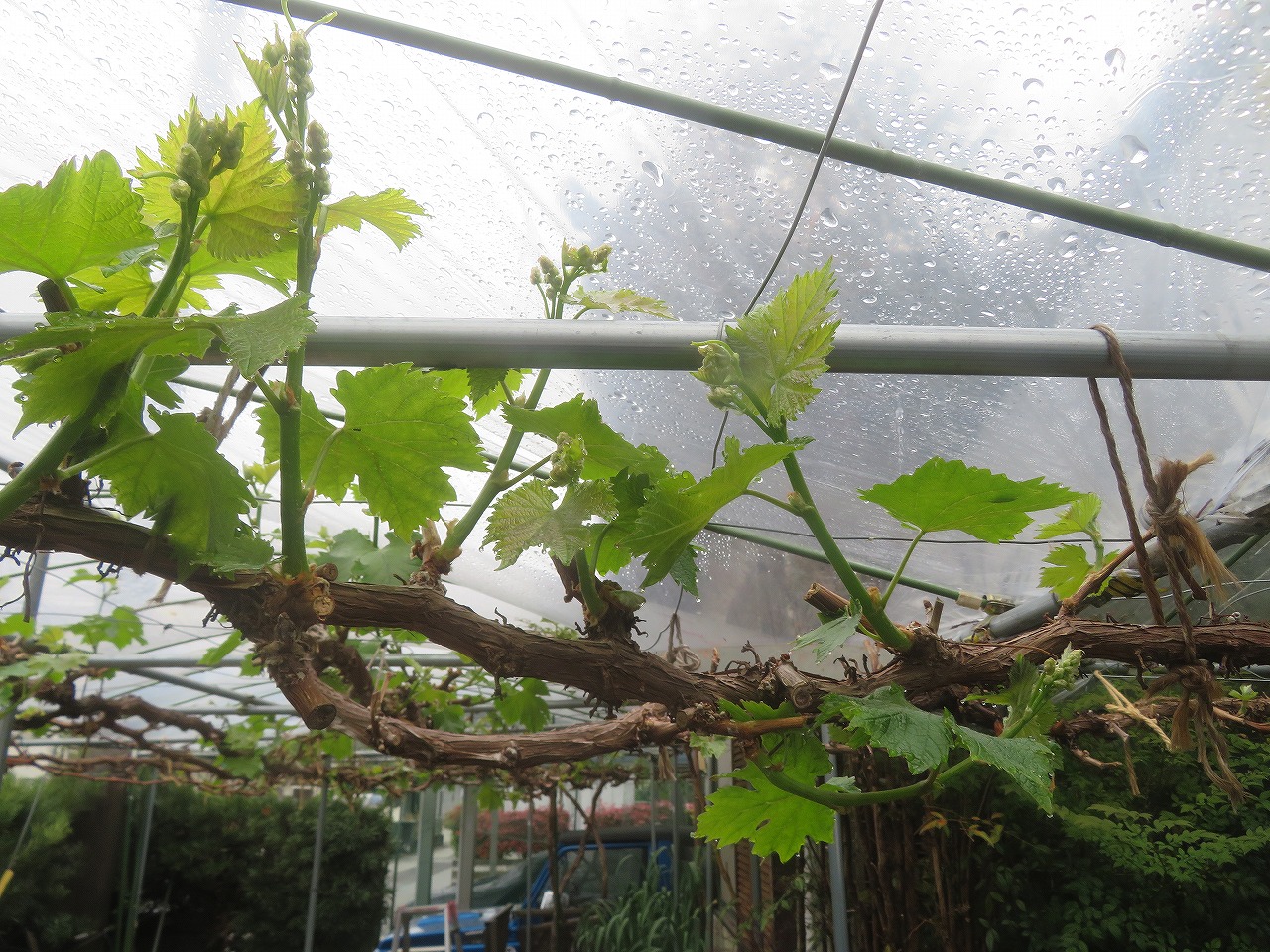 水曜日は朝から雨模様、朝一で雨の中納車に行き帰って来てからは暇なので先月の初めに芽ギス処理をして順調に発芽していますので弱い芽や内向き・重なり合う芽を指やハサミで早めに摘み取り枝の間隔をそろえて日当たりと風通しを考えて1節に複数芽が出ますので1芽だけ残して成長を促す芽かき作業を行いました。もう既に花芽も出ている枝も有りました。これからブドウのシーズンになりますので忙しくなります。🍇