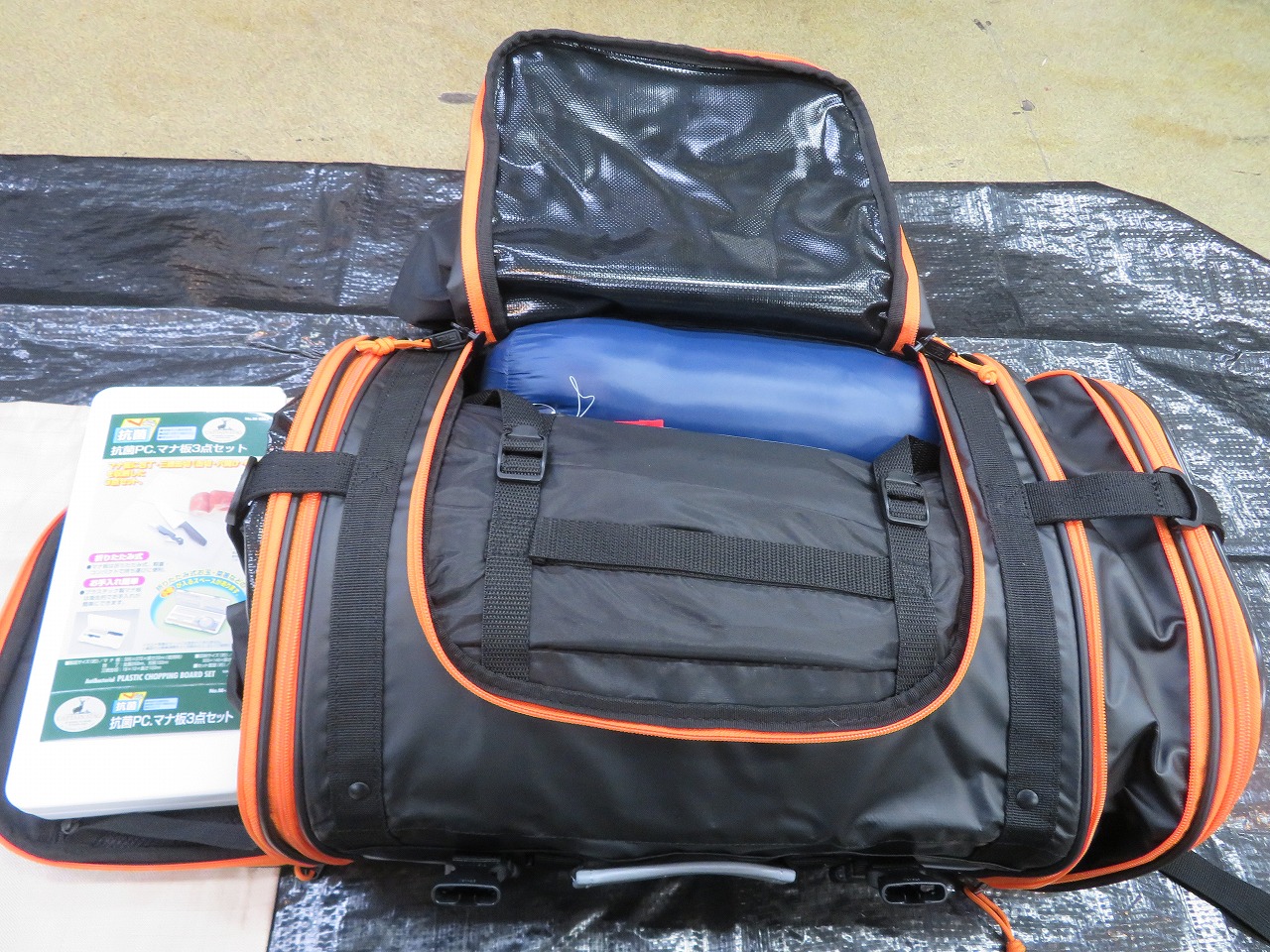 容量は通常29Lですが最大時は40Lまで可能な容量で横の長さも通常は52cmですが最大68cmまで長くなりますので長めのテントや寝袋、テーブル、椅子なども収納可能です、両サイドにはかなりの小物が収納出来てツ-リングネットを利用して上にも積載する事が出来ますので安心してキャンプツ-リングにも行けます。