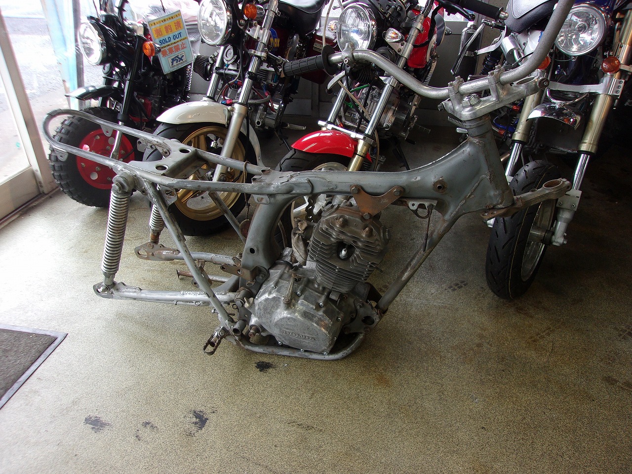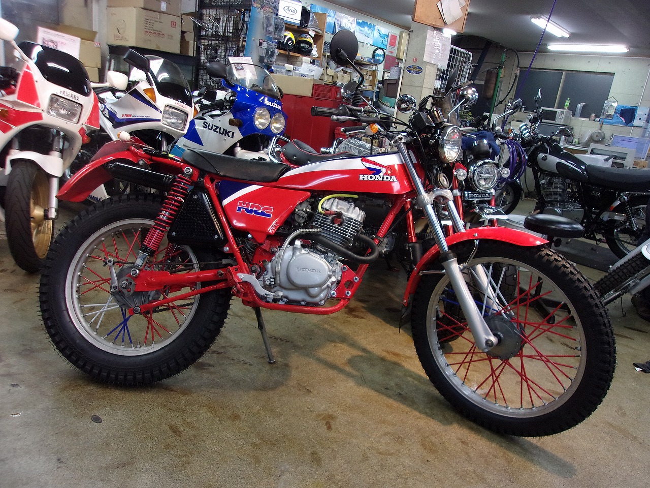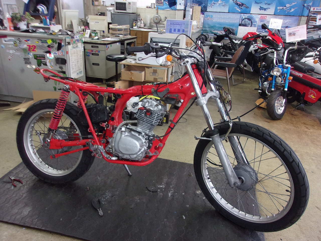 オ-クションで仕入れた1981年式のTL125イーハト-ブ、フレームが赤に塗装されていましたので思い切ってHRCカラ-に塗装しちゃいました。いい感じに出来上がったと思ったら常連さんに売れちゃいました。